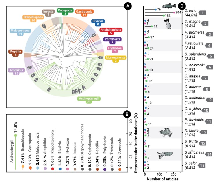 We identified and screened 5,988 articles, of which 901 were included in the final EIPAAB database, representing 1,739 species-by-compound combinations. The database includes data collected over 48 years (1974–2022), with most articles having an environmental focus (510) and fewer relating to medical and basic research topics (233 and 158, respectively). The EIPAAB database includes 173 distinct species representing 8 phyla and 21 classes. Ray-finned fishes were by far the most common clade (at 75% of the evidence base). The database also includes 426 distinct pharmaceutical compounds; the most frequently investigated groups were antidepressants (28%), antiepileptics (11%), and anxiolytics (10%). The impacts of pharmaceuticals on locomotion and boldness/anxiety behaviours were most assessed out of the 10 broad behavioural categories assigned in the database (62 sub-categories in total). Generally, we detected poor reporting and/or compliance with several of our study validity criteria, including the use of experimental blinding, randomisation, reporting of compound details, and exposure concentration verification.